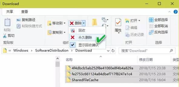 在文件资源管理器中定位到分发文件夹“C:\Windows\SoftwareDistribution\Download”,全选该文件夹下的所有文件夹,然后按下Shift+Del组合键(或从功能面板选择永久删除命令),执行永久删除操作。