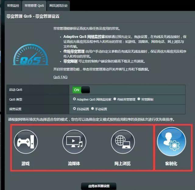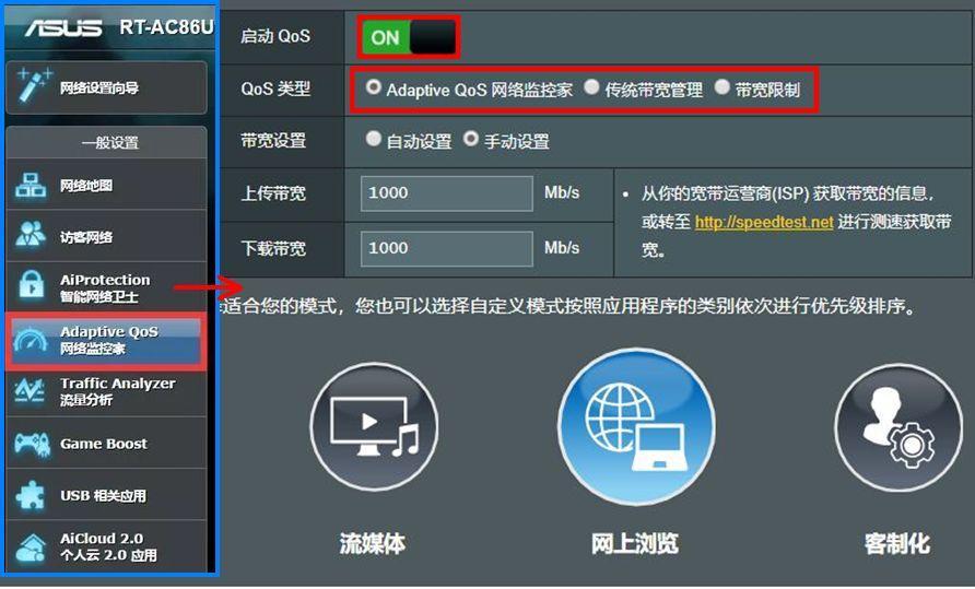 可以通过路由器的带宽限制来合理分配资源,以带有QoS(Quality of Service)带宽优化功能的华硕路由器为例,可以在路由器【Adaptive QoS网络监控家】【带宽管理QoS】中【启动QoS】。