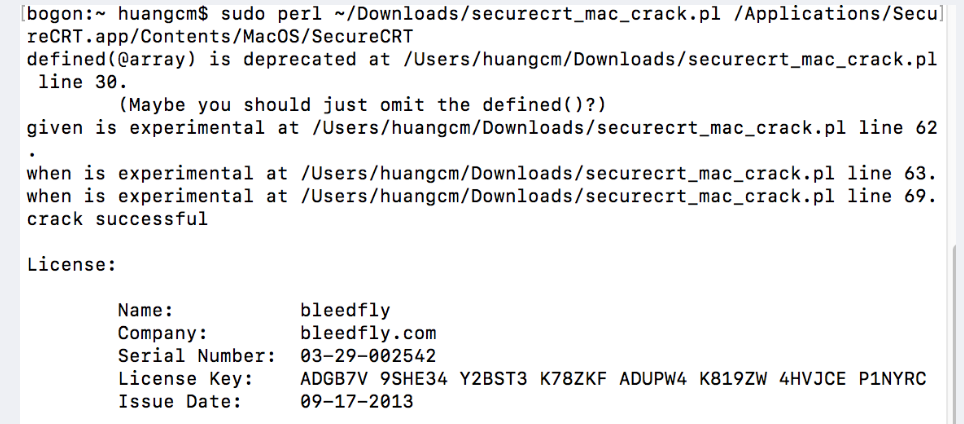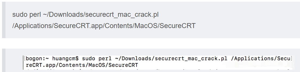 sudo perl ~/Downloads/securecrt_mac_crack.pl /Applications/SecureCRT.app/Contents/MacOS/SecureCRT