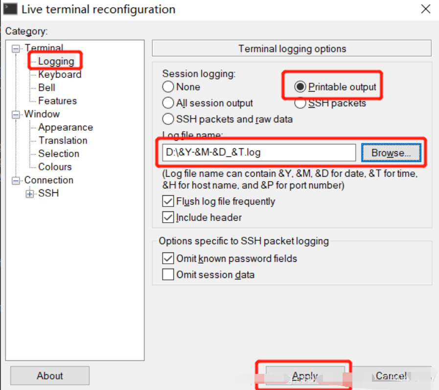 => “Terminal” => “Logging” ==>“Session logging” => “Printable output” //将可打印的信息打印出来