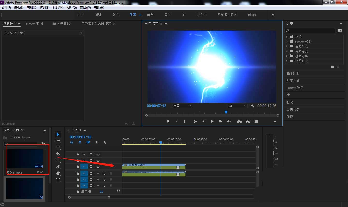 3、长按鼠标左键,将左侧导入的视频素材拖动到右侧时间轴上方。