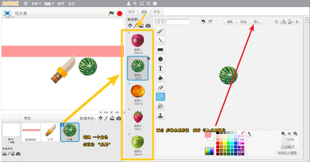 2、创建角色。创建4个角色:“游戏控制”“小刀”“水果”“炸弹”。(水果和炸弹角色,可以自己增加多种造型)