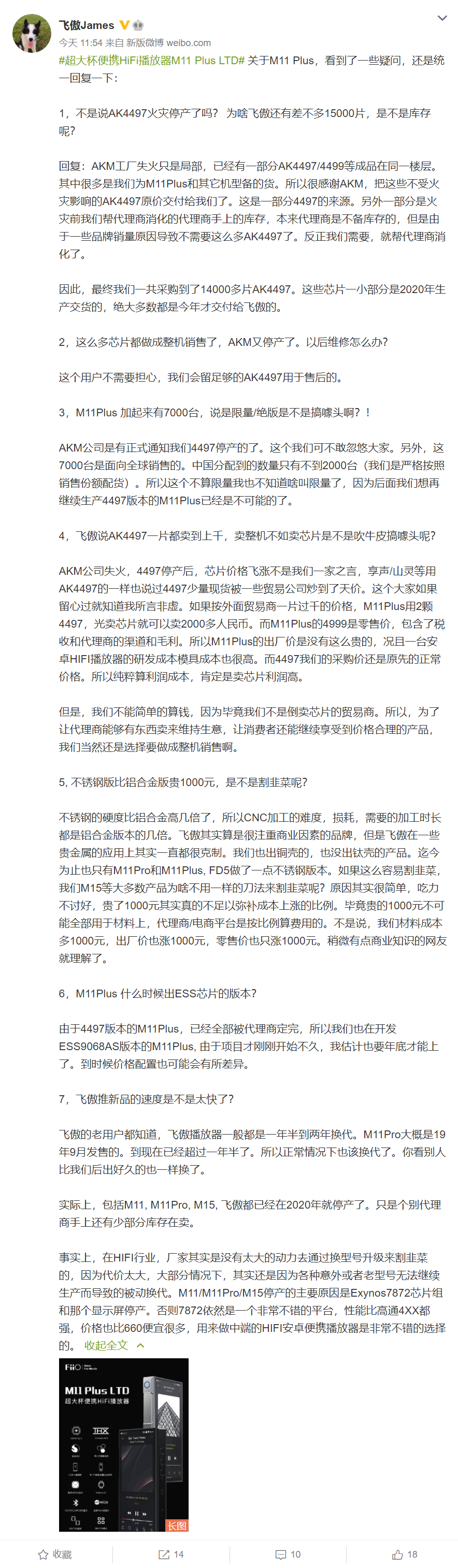 他还表示,公司已经留出了足够的芯片用于售后维修,用户不必担心。关于 AK4497EQ 芯片的停产问题,他还说接到了日本 AKM 公司的正式通知,宣布这款芯片停产。此外,AK4497 版本的 M11 Plus 播放器已经被代理商定完,搭载 ESS9068AS 芯片的同款播放器正在开发中,预计年底上市,但售价和配置会有所差异。