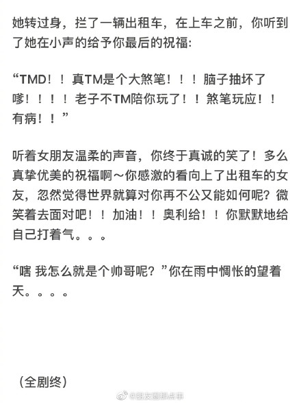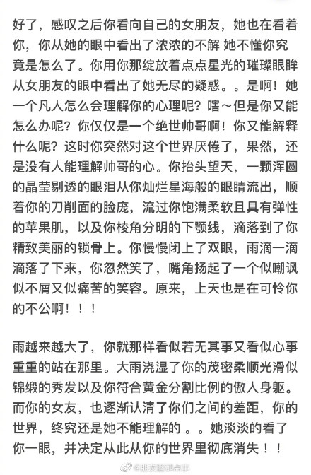 你抬头望天,一颗浑圆的晶莹剔透的眼泪从你灿烂星海般的眼睛流出,顺着你的刀削面的脸庞,流过你饱满柔软且具有弹性的苹果肌,以及你棱角分明的下颚线,滴落到了你精致美丽的锁骨上……书读多了的人就是不一样。