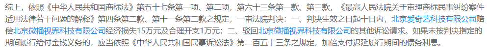 一审裁判结果为,本判决生效之日起十日内,被告北京爱奇艺科技有限公司赔偿原告北京微播视界科技有限公司经济损失 15 万元及合理开支 1 万等。