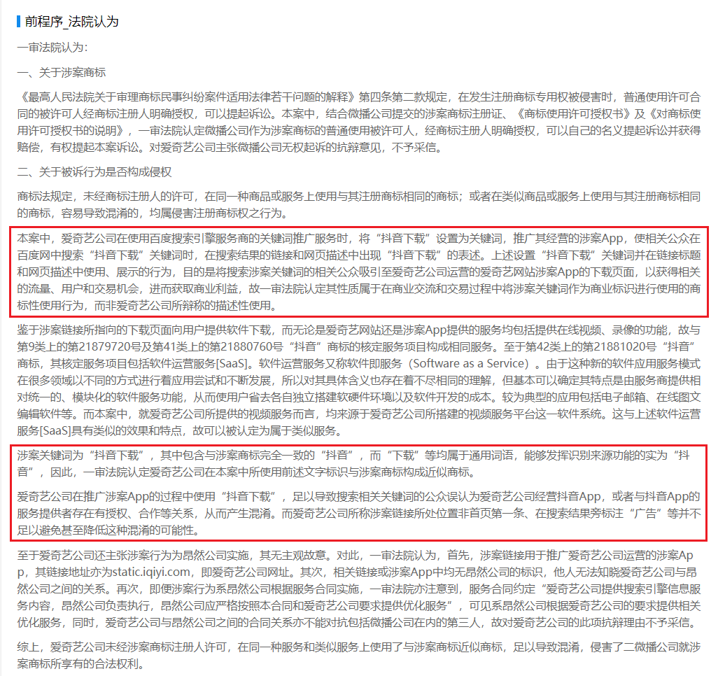 本案一审法院认为,爱奇艺公司在使用搜索引擎服务商的关键词推广服务时,将“抖音下载”设置为关键词,推广其经营的涉案 App,爱奇艺公司未经涉案商标注册人许可,在同一种服务和类似服务上使用了与涉案商标近似商标,足以导致混淆,侵害了二原告就涉案商标所享有的合法权利。