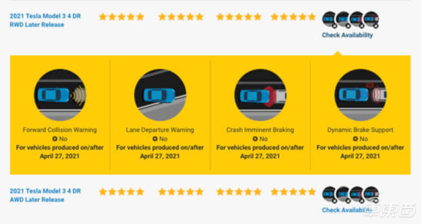比如美国国家道路交通安全管理局(NHTSA)在 Model 3 车型的测试报告上明确指出,他们只敢保证生产于 2021 年 4 月 27 日之前的车型具有前向碰撞预警、车道偏离预警、自动紧急制动、制动辅助功能。