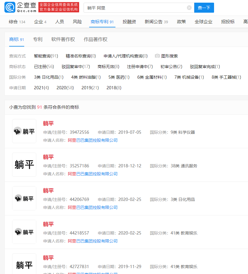 31 日消息 近日,躺平一词火爆网络,其实早在 2018 年 12 月阿里巴巴就曾注册躺平商标并开发相关应用。企查查 App 显示,阿里巴巴目前共申请注册躺平商标 91 次,其中 56 个商标已注册,包含躺平、躺平设计家、躺大平。