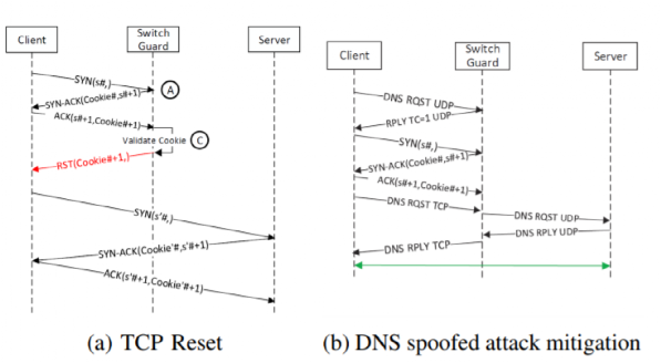 应对这种攻击的传统方法,是使用中间件来缓解。虽然 SDN 技术也可以被用来防御 DDoS 攻击,但它本身又引入了新的 DDoS 的攻击点。SYN-flood 攻击会使控制信道的链路容量和数据平面缓存很快成为瓶颈,就是个有血有肉的例子。