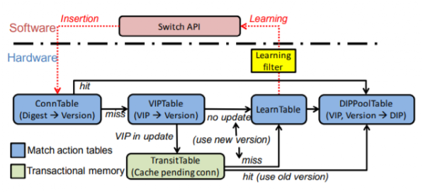 SilkRoad 使用可编程交换机来做带状态四层负载均衡,通过存储流的五元组哈希值与 DIP 池版本号来分别减少匹配域和动作的大小,从而实现在交换机上同时维护上百万条流的带状态连接。通过硬件实现的 bloom filter,用于确保即使 DIP 池发生更新,也能维持每条连接的一致性。