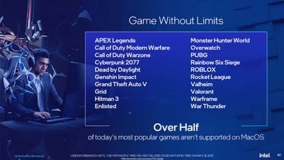 英特尔首席性能策略师 Ryan Shrout 在 PPT 中展示了英特尔 CPU 在各大游戏方面的优异性能,同时下方还有一行小字:“这些广受欢迎的游戏都不支持 macOS”。