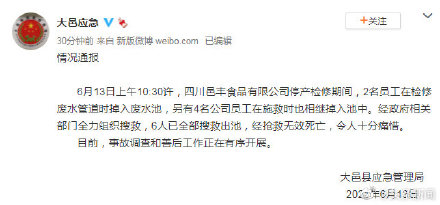 消息:6月13日上午10:30许,四川邑丰食品有限公司停产检修期间,2名员工在检修废水管道时掉入废水池,另有4名公司员工在施救时也相继掉入池中。经政府相关部门全力组织搜救,6人已全部搜救出池,经抢救无效死亡,令人十分痛惜。