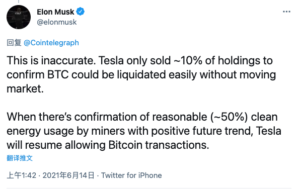 “一旦确认矿工们能够拥抱积极的未来趋势,合理的使用 (大约 50%) 清洁能源,特斯拉将恢复使用比特币买车的交易。”马斯克称。另外,他还表示,特斯拉只出售了大约 10% 的比特币持有量,以确认比特币可以在不影响市场的情况下轻松结算。