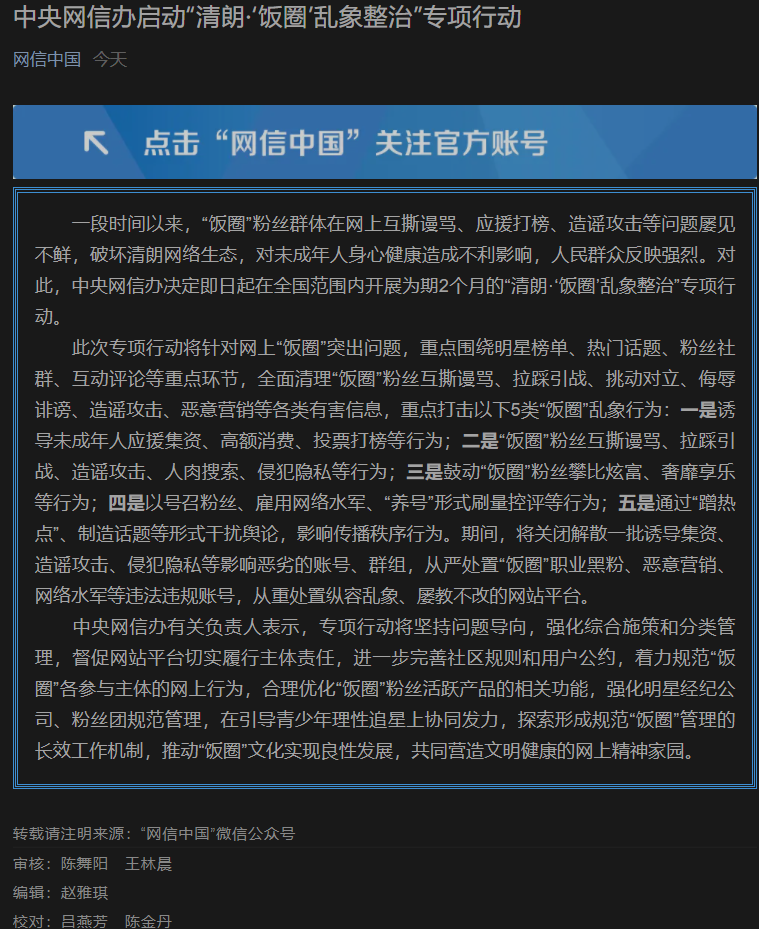 此次专项行动将针对网上“饭圈”突出问题,重点围绕明星榜单、热门话题、粉丝社群、互动评论等重点环节,全面清理“饭圈”粉丝互撕谩骂、拉踩引战、挑动对立、侮辱诽谤、造谣攻击、恶意营销等各类有害信息,