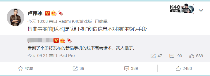 15 日消息 今天是端午假期后上第一天,小米集团副总裁、中国区总裁、红米 Redmi 品牌总经理卢伟冰继续谈论“线下机”现象,其表示:扭曲事实的 [话术] 是“线下机”创造信息不对称的核心手段。