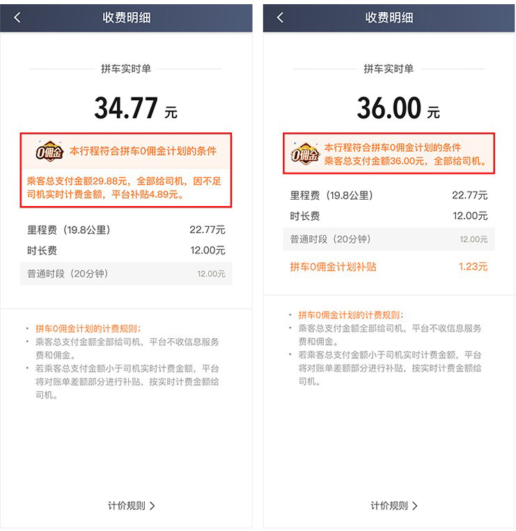 在拼车 0 佣金计划的司机账单中,师傅们可以清楚地看到,所有乘客总支付的金额、司机全行程实时计价的金额、以及各项平台补贴金额(如有)。但是,当乘客总支付金额小于司机实时计价金额时,司机依旧按照实时计价获得收入。也就是说,当乘客支付费用不足时,平台会补给司机师傅。