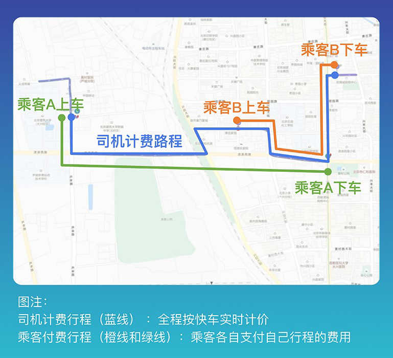 简单来说,从乘客 A 上车点到乘客 B 下车点,是司机的计费行程,根据快车实时计价规则,按照实际行驶里程和时长计算司机的收入。也就是从第一位乘客上车,到最后一位乘客下车,全行程按快车实时计价。