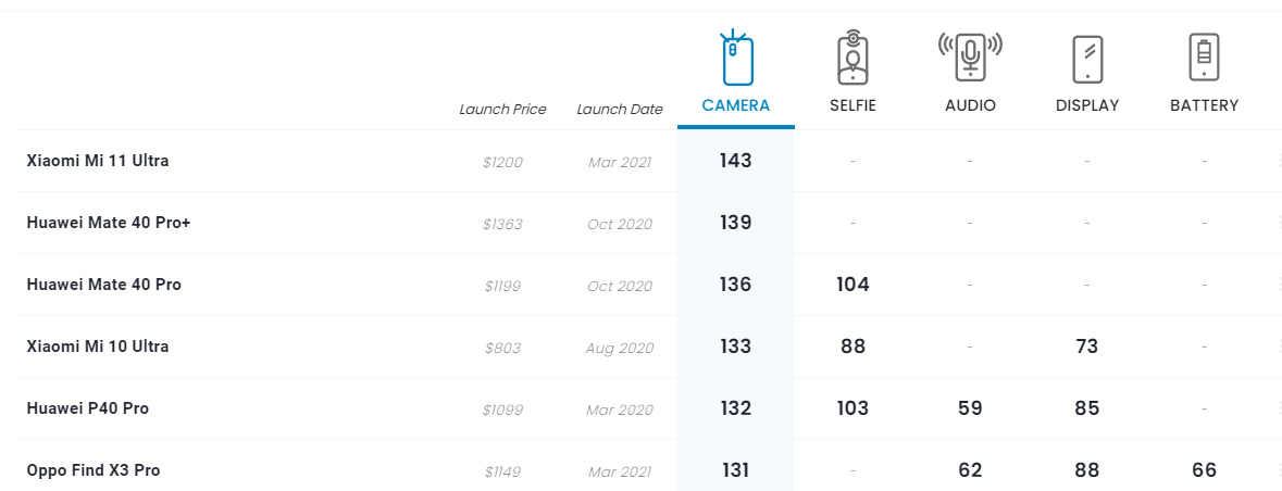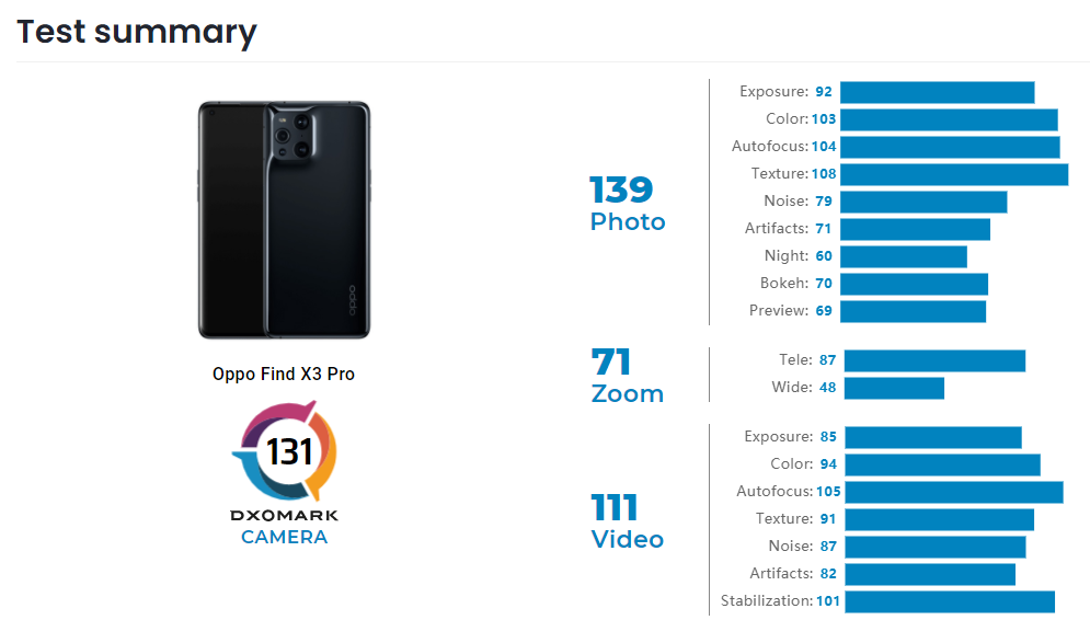 此外,DxOMark 还公布了 OPPO Find x3 Pro 的相机、屏幕和音频评测结果,其中影像得分 131 分暂列第 6 名;屏幕得分 88 名列第十;电池得分 66 排在第 16 名,音频不在榜单前列。