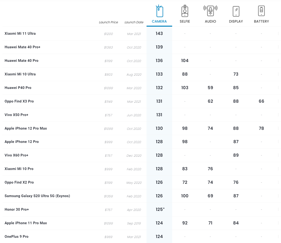 此外,该机在 DXO 为美国上市机型单独列出的榜单中名列第四或并列第三,仅次于两款苹果 iPhone 12 机型。