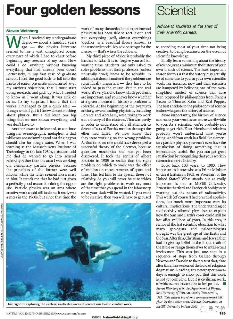 2003 年,他曾在 Nature 上发表了 Four golden lessons,给予那些即将进入研究生涯的大学毕业生一些建议,放在今日,也依然受用。