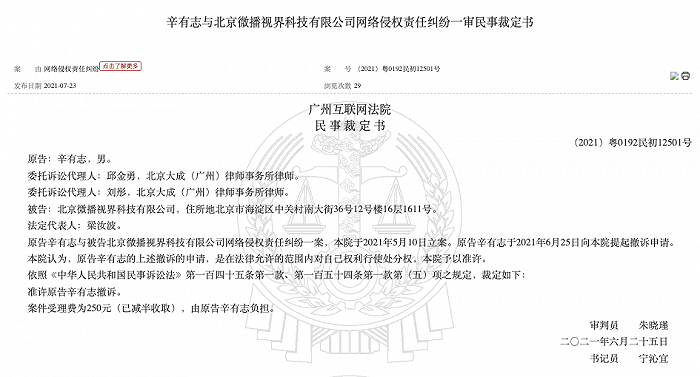 裁定书显示,原告辛有志与被告北京微播视界科技有限公司网络侵权责任纠纷一案于 2021 年 5 月 10 日立案。原告辛有志于 2021 年 6 月 25 日向法院提起撤诉申请。