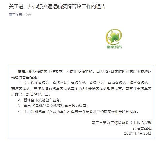26 日消息“南京发布”微信公众号 7 月 26 日消息,南京市新冠疫情联防联控工作指挥部交通管控组发布通告指出,根据近期疫情防控工作要求,为防止疫情扩散,自 7 月 27 日零时起实施以下交通运输疫情管控措施: