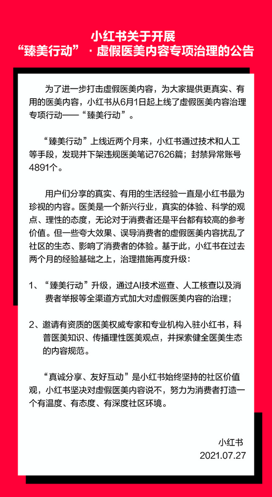 27 日消息 小红书今日发布站内公告称,针对虚假医美内容的专项治理“臻美行动”上线近两月,已下架违规医美笔记 7626 篇,发现并封禁异常账号 4891 个。