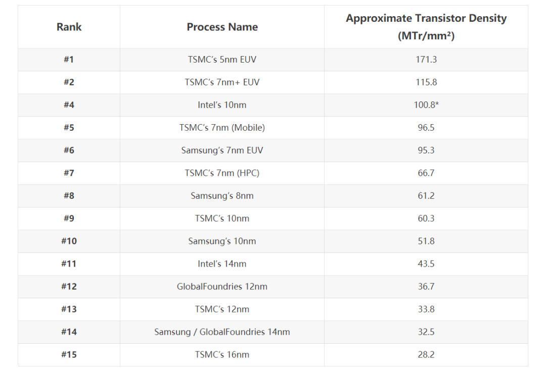 在 10 纳米上,英特尔的晶体管密度达到 100.8(即每平方毫米 1.008 亿晶体管),远远超越台积电和三星的晶体管密度。台积电在推出 7 纳米工艺时(晶体管密度 96.5)才接近英特尔 10 纳米的晶体管密度,之后台积电在 7 纳米改进版(7nm+)工艺上引入 EUV 光刻机,凭借 115.8 的晶体管密度实现对英特尔 10 纳米的最终反超。