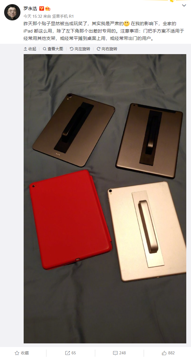 今日下午,罗永浩再次表示,昨天那个贴子显然被当成玩笑了,其实他是严肃的。在他的影响下,除了一个出差时专用的外,全家 iPad 都这么用。