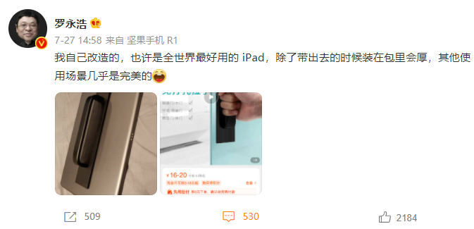 28 日消息 昨日,锤子科技 CEO 罗永浩在微博晒出了自己改造 iPad 的设计图片,并称“自己改造的,也许是全世界最好用的 iPad”。