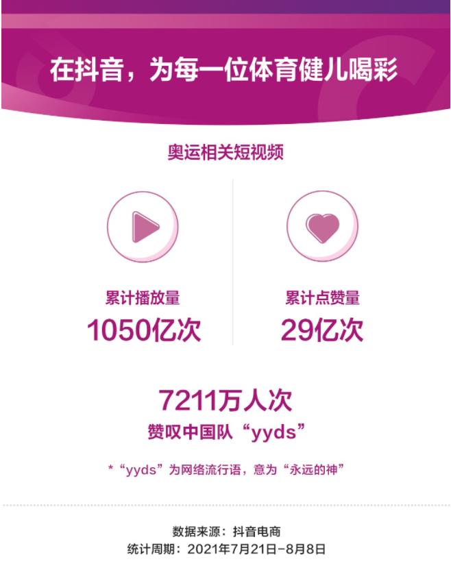 9 日消息 抖音电商在今日发布了东京奥运会期间平台内相关数据,数据显示,7 月 21 日至 8 月 8 日,抖音电商体育用品销售额同比增长 365%。
