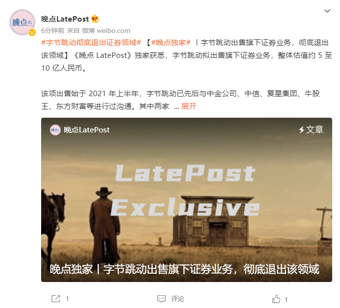 9 月 1 日消息 根据微博 @晚点 LatePost 消息,字节跳动今年起计划出售旗下的证券业务,整体估值 5 亿-10 亿元人民币。该出售计划于 2021 年上半年开始,其先后与中金公司、中信、复兴集团、牛股王、东方财富等进行过沟通,其中两家公司给出了投资意向书。