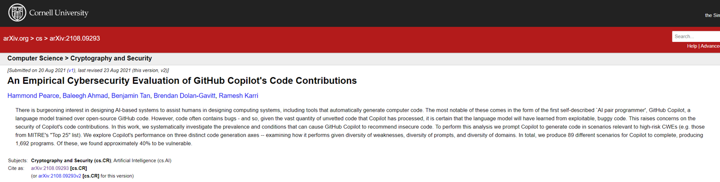 近日,康奈尔大学的研究人员公布了一项数据,他们为 GitHub Copilot 生成了 89 个不同的场景,生成了 1692 个程序。其中,大约 40% 的程序存在漏洞。