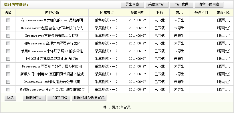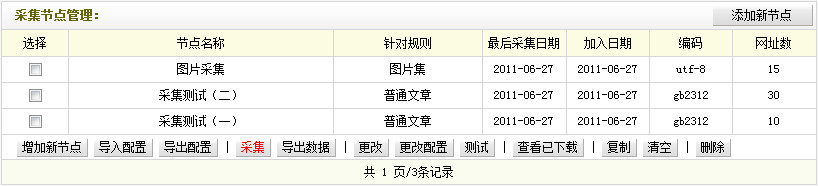 可以看到,在采集节点管理界面中,已经有了之前所介绍的三条采集规则。下面我们从左到右介绍,底部的一排按钮。