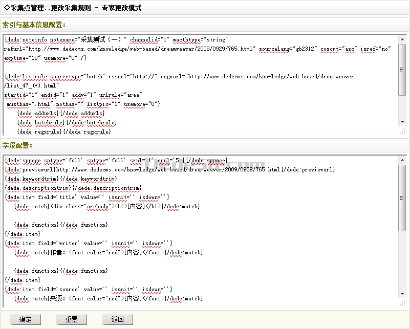 “更改”和“更改配置”:单击这两个按钮,都可以进行采集规则的更改。所不同的是单击“更改”后,是使用普通更改模式,来更改采集规则(如图9);而单击“更改配置”后,可使用专家更改模式,来更改采集规则(如图10)。