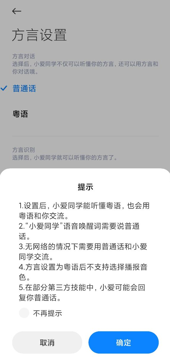 用户需使用小爱同学 5.0 版本及以上,在“小爱实验室”—>“方言设置”中选择“粤语”。