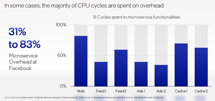 根据 Facebook 给出的数据,基于微服务的现代应用占用了大量的 CPU 循环,从 31%-83% 不等,比如在 Web 应用中,83% 的 CPU 循环被用于开销,包括传输、压缩、解压缩、加密等功能。如果把这些开销从 CPU 转移到 IPU,云服务提供商就可以把整个 CPU 租给客户。