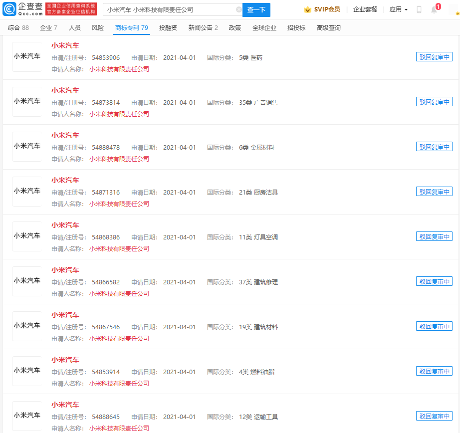 企查查 App 显示,近日,多个小米汽车商标状态变更为驳回复审中,商标国际分类涉运输工具、广告销售等。
