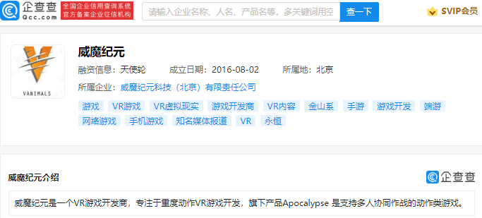 企查查信息显示,威魔纪元是一家 VR 游戏开发商,公司成立于 2016 年,法定代表人为王鲲,经营范围包含:技术开发;技术推广;技术转让;技术咨询;技术服务。