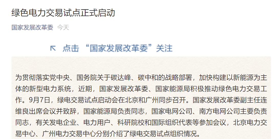 9 日消息 据国家发改委微信公众号消息,绿色电力交易试点正式启动。9 月 7 日,绿电交易试点启动会在北京和广州同步召开。