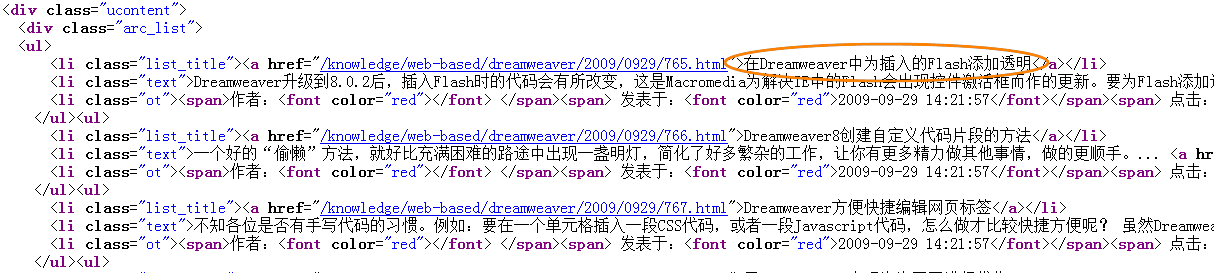 (a)对于“区域开始的HTML”,可通过在打开的文章列表首页上,单击右键后选择“查看源文件”。在源文件中,找到第一篇文章的标题“在Dreamweaver中为插入的Flash添加透明”,如(图17)所示,