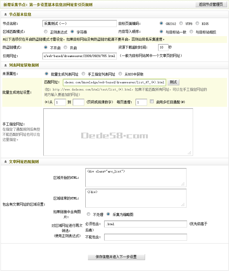 全部完成并检查无误后,单击“保存信息并进入下一步设置“。如果之前设置正确,单击后,将会进入“新增采集节点:测试基本信息及网址索引页规则设置的网址获取规则测试”页面并看到相应的文章列表地址。如(图21)所示,