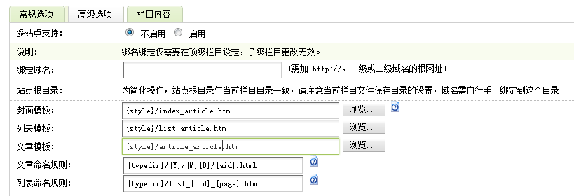 依此类推,如果在常规选项中栏目属性是最终列表栏目,高级选项中封面模板为{style}/list_article.htm,则会调用list_article.htm作为模板,文档模板也依此类推。