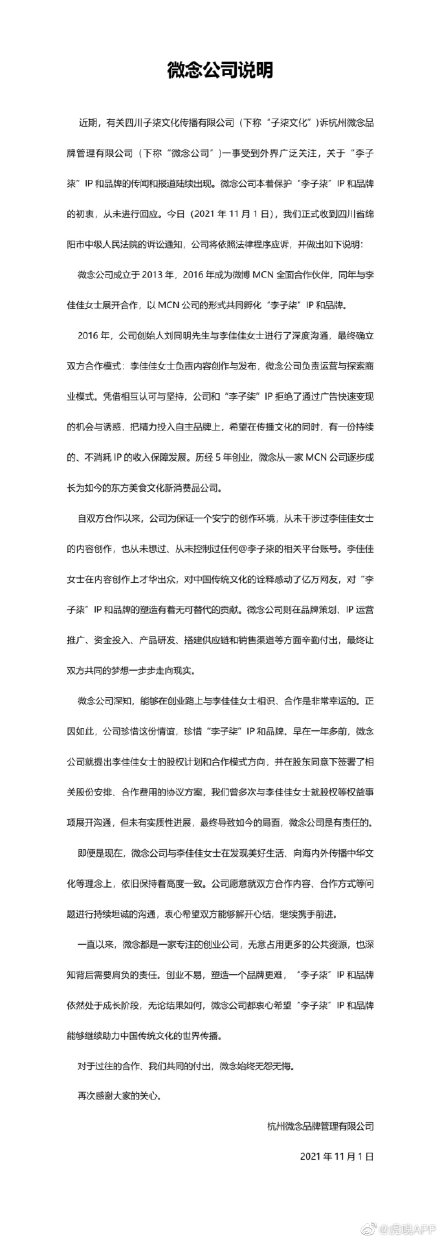 微念就与李子柒股权纷争一事发布情况说明。微念称:“早在一年多前微念就启动了李佳佳的股权计划并和全体股东签署了相关协议,且尊重她本人的意愿。公司愿意就双方合作持续坦诚的沟通。”微念公司表示,从未控制过任何@李子柒 的相关平台账号。李佳佳本人也曾在评论区回应过账号属于她本人。