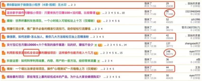 阅读量最高的标题大概都带有这些字眼:适合新手、全自动、零基础、小白可做、躺赚、月入几十万等。