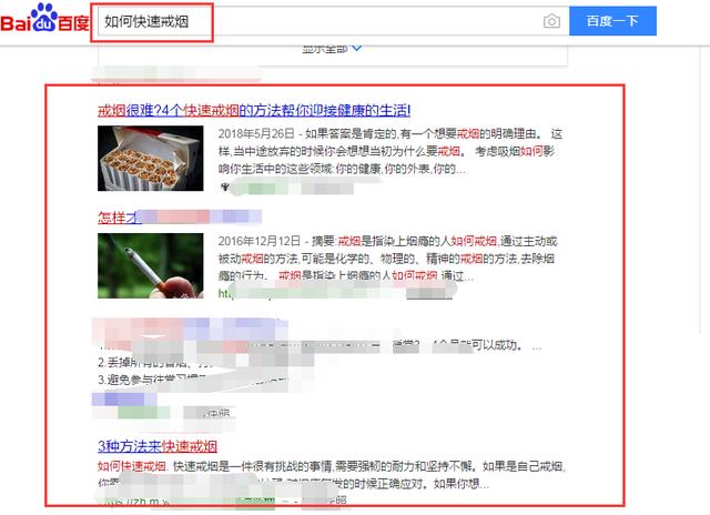 举例:A现在是一个十年的老烟民,最近年纪大了,想要戒烟,拥有更健康的身体,于是A在度娘去搜索“如何快速戒烟”,搜索结果如下,