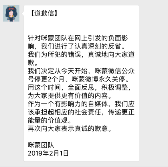 年前,咪蒙旗下的“才华有限青年”发布《寒门状元之死》一文,因为虚构细节,引发广泛争议,咪蒙也成为矛头所指。面对舆论压力,咪蒙曾发公开信称:因咪蒙团队引发的负面影响,咪蒙微信公众号停更2个月、咪蒙微博永久关停。