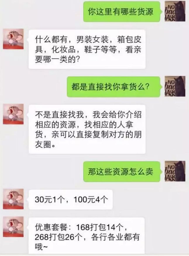关于这个项目,有人打造假的微信货源号来赚钱,至于所谓的货源商品图基本全是阿里的搜图,他们其实根本没有货,而是直接从阿里照搬。有句话说的好,“网络上价格便宜的是淘宝,比淘宝更便宜的就是阿里巴巴”。有很多淘宝卖家,就是在阿里巴巴找的一件代发,淘宝卖出一件,他就去阿里拍一件,留顾客的收货地址,就是这么简单。