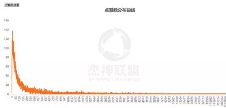 通过对这2万条数据进行点赞的分布曲线的清洗,我们可以清晰的看出,大部分的视频点赞数都在700以下,超过10000点赞数的视频并不多。