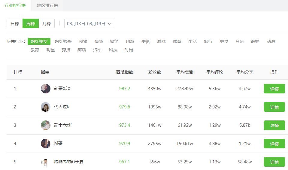 此款APP的播主排行榜不仅为我们直观地呈现各行业播主排行,平均播放量、点赞、评论量等方面的数据,